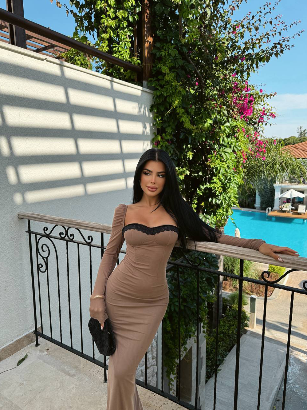 Fustan i gjatë mëngë tyl me lidhëse dhe i çare mbrapa. Detaj zbukurues me dantell. Ngjyra: Kafe Materiali...