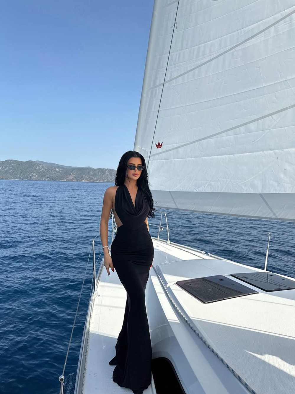 Fustan i gjatë pas trupit hapur para dhe shpinën zbuluar. Pjesa e poshtme në linjë veref.Ngjyra: E...