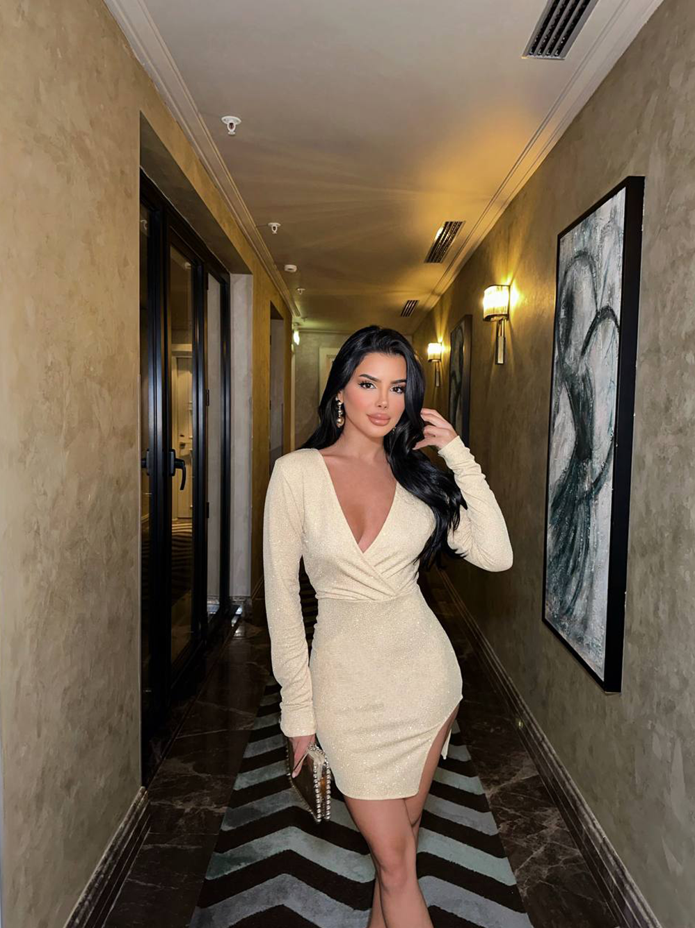 Fustan i shkurtër me dekolte V. Detaj zbukurimi me shkëlqyes me një ngjyrë, i çarë anash. Ngjyra:...