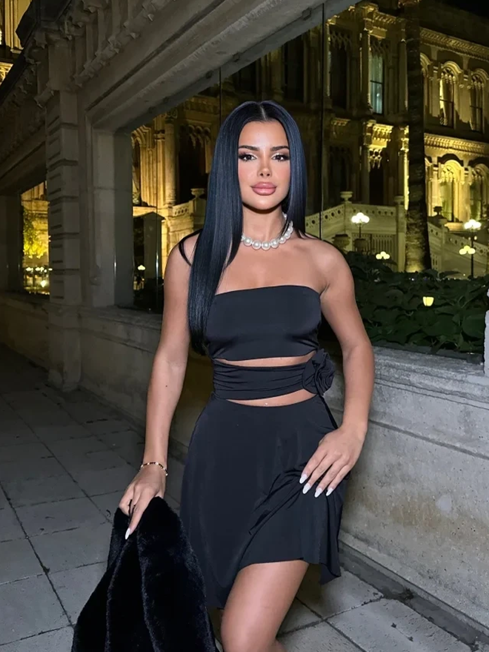 Fustan mini me supe të zbuluara e çarje në bel. Detaj zbukurues fjongo. Ngjyra: E zezëMateriali i...