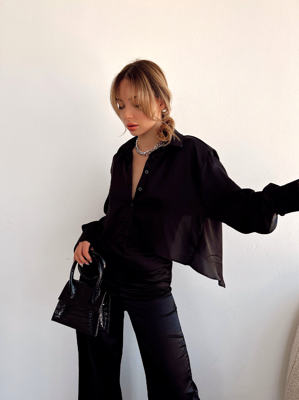 Këmishë sateni me jakë dhe mëngë të gjata me mansheta. Mbërthim i përparmë me kopsa. Ngjyra: E zezë Materiali i...