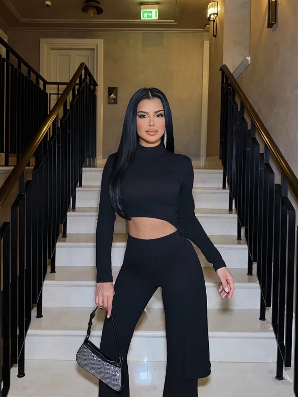 Set crop top me mëngë të gjata dhe pantallona. Detaj me të çarë në bel.Ngjyra: E zezëMateriali...