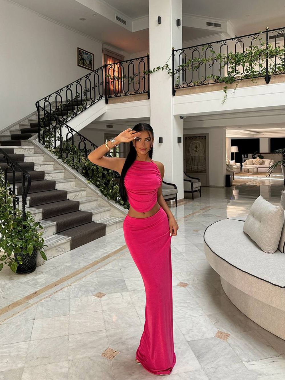 Set crop top me lidhje në pjesen mbrapa dhe fund i gjate. Ngjyra: Rozë Materiali i jashtëm:...
