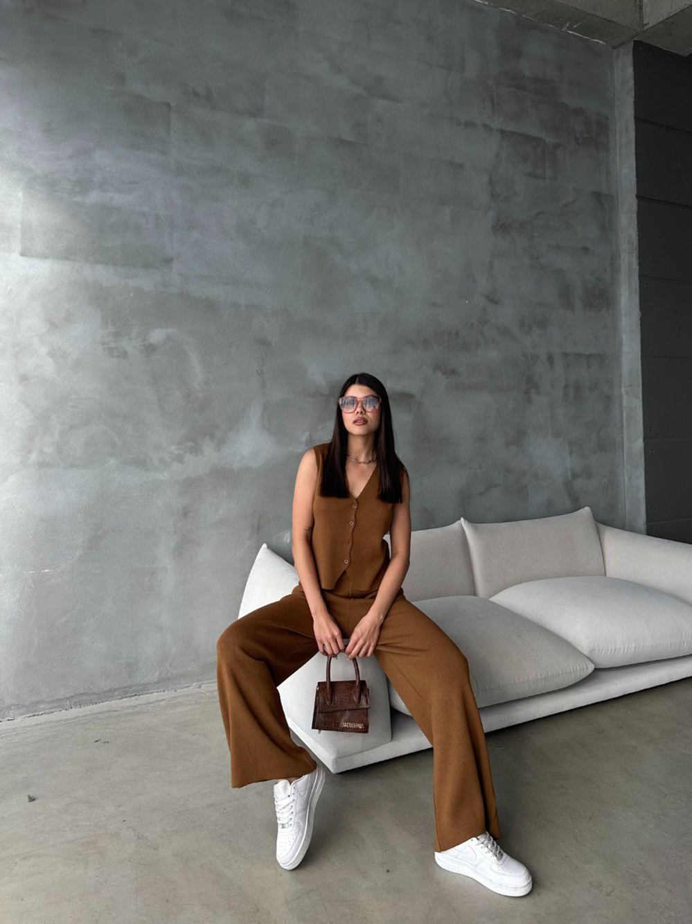 Set jelekë me dekolte V dhe pantallona me shtrat të lartë dhe bel elastik. Ngjyra: Kafe Materiali i...