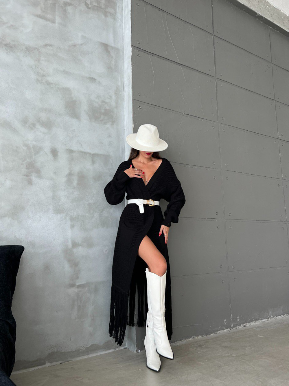 Triko me jakë V dhe mëngë të gjata. Detaj me zbukurim me thekë në fund.  Ngjyra: E zezë...